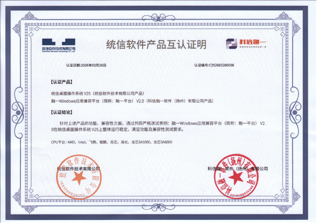 2026年3月26日,科信融一软件(扬州)有限公司旗下核心产品融一Windows应用兼容平台V2.0(简称:融一平台V2.0),与统信软件技术有限公司重磅推出、通过国家安全可靠测评的旗舰产品统信桌面操作系统V25,正式完成官方兼容互认,斩获统信软件权威认证(认证编号:C252603260006)!
